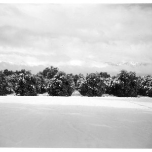 A view of San Marino Ranch orange orchards after a rare southern California snowfall. MS note on verso reads "Jan. 11, 1948" and "Huntington grounds". Date should read January 11, 1949.