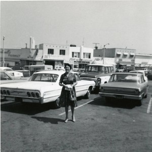 Christine Parnin, Library Manager of City Terrace Library, stands in the library's parking lot, summer 1966; several neighboring business are in the background.