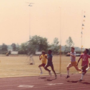 Competitors race in the Los Angeles Unified School District 1984 Youth Services Games, sometimes referred to as the 'Junior Olympics,' held at East Los Angeles College (ELAC).