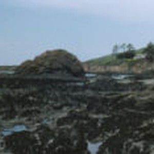A white house sits atop a cliff, looking over the large rocks off the coast at Cayucos.