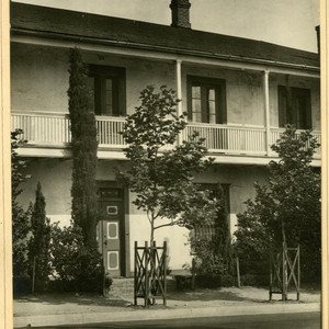 Adobe, Monterey, California: front doors, 2-story house w/balcony [Casa Amesti, 516 Polk St.].
