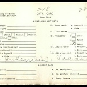 Text / WPA Low income housing area survey data card 218, serial 22364, vacant