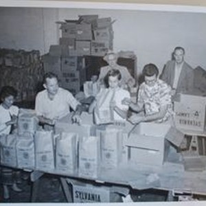Photo--black and white: Sebastopol Lions Club scrapbook photo: Lions Club project with members and students filling paper bags. Adults L-R: Joe Johnson, Dick Dickenson, Phil Wetch and Harold Bratten. Circa 1955. Photo by Emilie Frazer