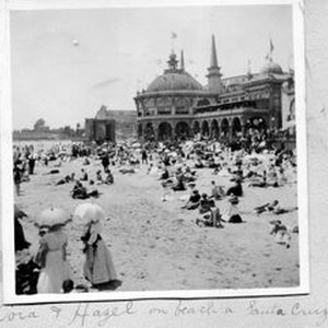 Sisters Cora L. Miller (Elvy) and Hazel Odetta Miller (blackesley, Frazee) at the Santa Cruz beach in 1908