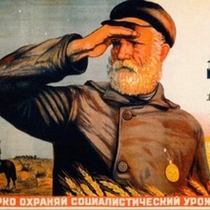 A poster encouraging Soviet collective farmers to guard the "socialistic" crop. Caption reads, "Zorko okhraniai sotsialisticheskii urozhai / Зорко охраняй социалистический урожай", meaning, "Stay alert while guarding the socialistic crop". [Description English/roman)]