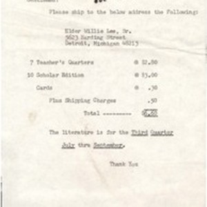 Willie Lee, Sr., letter, 1970 May 19, to D.J. Young Publishing Company requesting Sunday School Literature. [Description English/roman)]