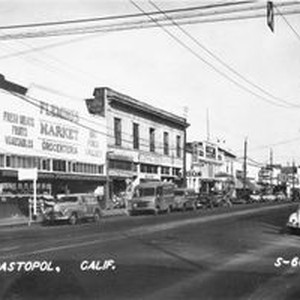 Photo - black and white: North Main Street Sebastopol looking north circa 1940. Businesses seen are Fleming's Market, Metcalf Hardware, Stans Clothing Store, Appleton Bakery, Real Estate and Insurance office, Starr Furniture, Sprouse Reitz, Rexall Drug Store.