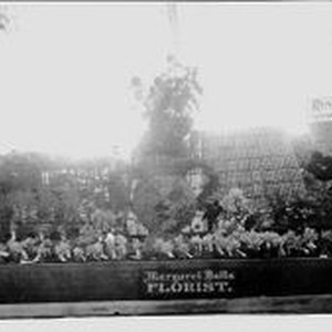 Postcard--photo--black and white: Sebastopol's Gravenstein Apple Show display of flowers in foreground with large vase made of flowers. Margaret Butts Florist sign. In background an apple display is "Rincon Farm Frank A. Brush, Santa Rosa"