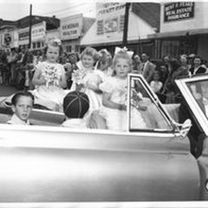 Photo--black and white: Sebastopol Apple Blossom Princesses circa 1951. Girls are unidentified. Car driver- Stan Janes of Stans Men's Store; woman top left of Stan is Billie Herring, Ed Herring's wife; Man to right of girl in front seat is Glenn Winkler. Winkler fought Jack Dempsey when Dempsey came to Sebastopol. Ring set up in SAGU building.