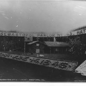 Photo--black and white : Gravenstein Apple Show in 1913, display of Sonoma Mission in apples.Signs in apples: "Sebastopol Parlor No. 143" (Native Sons of the Golden West) and "Sonoma--June 14, 1846" commerating Bear Flag Revolt in the town of Sonoma, California.