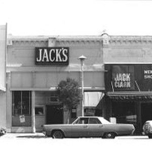 Photo--black and white: Sebastopol businesses on Main Street. Jack's Bar, Jack Clark Men's and Boys shoes. Circa 1960s-70's "Off Sale" neon sign in bar window.