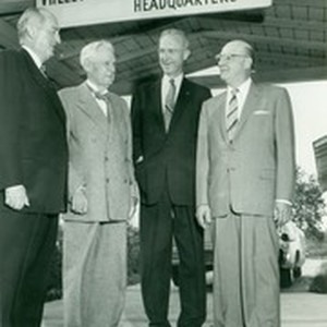 Mr. Whitsett and three men standing in front sign which reads "Valley Presbytarian Hospital Headquarters"