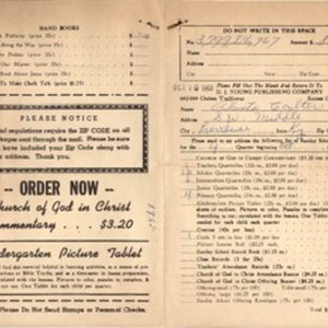 Order Form (Almeta Coulter) requesting Sunday School Literature from D.J. Young Publishing Company, 1969 Oct. 10. [Description English/roman)]