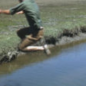 Student in mid- flight leaping over channel in the Morro Bay salt marsh.