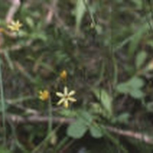 Yellow flowers in various states of bloom, thin petals at North Fork Kings River chuts area at 9000 feet elevation. Slide mount references Triteleia anilina.