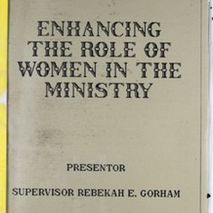 Enhancing the role of woman in the ministry, presentation by Rebekah E. Gorham, after 1987. Also includes a reprint of an article: Lizzie Roberson. "History of the bible band" in Christian hope magazine (1937 April). [Description English/roman)]