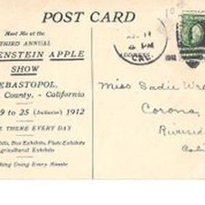 Postcard, black and white: A 1912 Gravenstein Apple Show advertisement postcard for the 3rd annual show in Sebastopol. Postmarked with 1 cent stamp and handwritten message on verso.