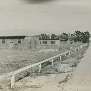 A photograph of de-commissioned buildings on the former Marine base, possibly former officers' quarters.. Some of this type of building are still being used today for office space, including housing the ROTC and Military Science department. During the early years of the campus, these buildings were used as dormitories for male students until new residence halls were built.
