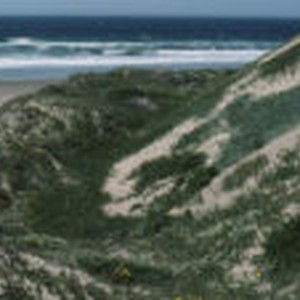 Panoramic view of the coastline at Morro Bay with sand dunes in the foreground.