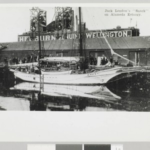 Full length profile image of the Snark, docked in the Oakland/Alameda Estuary. A crowd of people are on the dock and a few people work on deck of boat. Title and date transcribed from envelope. Copy print of original. Print in right hand corner of photo reads: "Jack London's 'Snark' on Alameda Estuary."