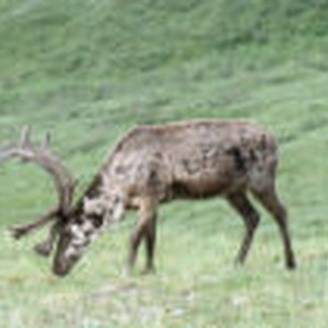 Close-up of a caribou with its head pointing downwards towards green vegetation near the Eielson Visitor Center.