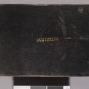 Bound in textured black material. The title, "Australia," is embossed in the center of cover in gold lettering. The number "65" is affixed to the top of spine with glue. Images are primarily postcards and souvenir photographs, including several of the Burns-Johnson boxing match in Sydney. Album is intact, but with significant scuffing on surface and wear around edges and spine.