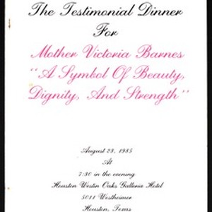 Testimonial dinner program, Victoria Barnes, Houston Westin Oaks Galleria Hotel, Houston, Textas, 1985 August 23. [Description English/roman)]