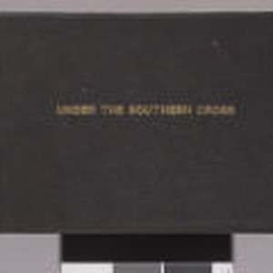 Album is bound in textured black material. The title, "Under the Southern Cross," is embossed in gold lettering in the center of the front cover. The number "56" is affixed to the top of spine with glue. Images are primarily commercial souvenir photographs and postcards probably purchased during the London's stay in the Gilbert Islands. A few panoramic landscapes and other views are possibly taken by Jack London. Very light wear on surface and edges. There is a small nick in the material on the back cover. Only pages 1-55 contain photographs, rest of pages are blank. Pages were interleaved with onion skin by the album manufacturer.