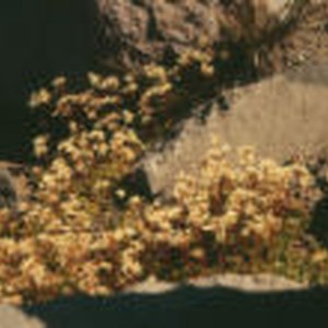 Cluster of small white flowers nestled in between rocks.