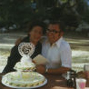 Mr. and Mrs. Ott celebrate their 25th wedding anniversary at Mount Baldy. The couple sit on a park bench behind their anniversary cake.