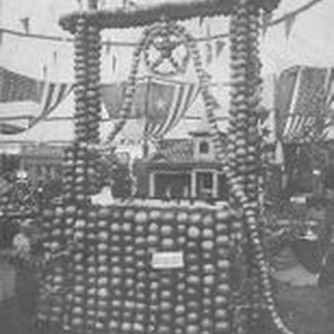 Postcard photo, black and white: 1910 Gravenstein apple Show exhibit of an well made of whole apples.