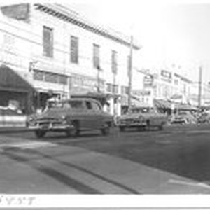 Photo--black and white: Main Street Sebastopol, September, 1958. Period vintage cars are on the street. Stores seen are Fleming's Market, Stan's Clothing store, Appleton Bakery, Starr Furniture, Pine Cone restaurant and others. The Methodist church can be seen in the far right background.