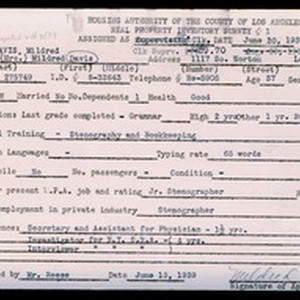 Text / WPA household census employee document for Mildred Davis, Los Angeles