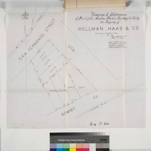 P.16 of document, "Petition of Martha Reyes del Carbajal to the Hon. the Common Council of the city of Los Angeles..." property of Hellman, Haas & Co.; 7 lots between Downey Ave. & San Fernando St., showing courses, distances, posts, S.P.R.R. and Horse R.R.. Alt. title supplied by cataloger.