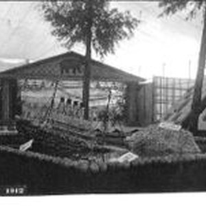 Postcard--photo--black and white: Sebastopol's Gravenstein Apple Show display of the sinking of the Titanic with an iceberg made of apples and sign "W.S. Liddle" on the iceberg. Background: Liddle cycled around the world in 1907 at the age of 26 and eventually lived in Sebastopol. Liddle is buried at Sebastopol Memorial Lawn Cemetery.