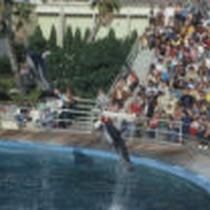 Two dolphins jumping in the air during a show at the Marineland amusement park.