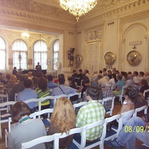 Photographs of 2 views of an audience at a book launch, Odessa, Ukraine, 2011 September 8. The concert hall is trimmed in gold leaf with exhibits on the walls. [Description English/roman)] Фотографії 2 вид на аудиторія на презентації книги, Одеса, Україна, 2011 8 вересня. Концертний зал оброблена сухозлітним золотом з експонатами на стінах. [Description (original non-English/roman language/script)]