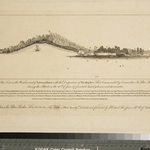 A N. E. View of the Fort on the Western end of Sullivans Island with the Disposition of His Majesty's Fleet commanded by Commodore Sir Peter Parker Knt. &c. &c. &c. during the Attack on the 28th of June 1776 which lasted 9 hours and 40 minutes