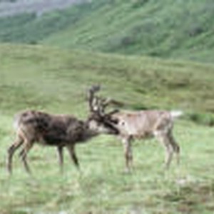 Two caribou beside each other with antlers in a field of green vegetation near the Eielson Visitor Center.