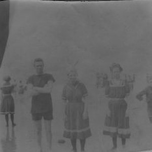 Photo--black and white:- group in bathing suits--probably circa 1910s- from Ms. Barney's grandmother, Maude Barlow Newman, probably taken by her cousin Edna Purrington. Location is possibly Russian River.