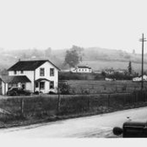 Photo--copy black and white: Freestone House in foreground located at 489 Bohemian Highway. Circa 1930s. In middle background is the Freestone School, built in 1852 on the western foot of O'Farrell Hill, property owned by Jasper O'Farrell. Freestone Congregational Church in area but unidentified.