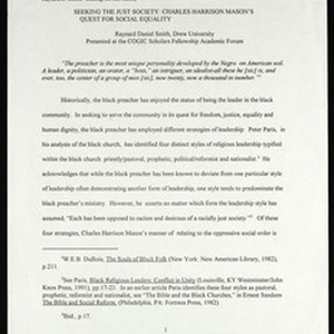 Raynard Daniel Smith. "Seeking the just society: Charles Harrison Mason's quest for social equality", ca.2000. Presented at the Church of God in Christ Scholars Fellowship Academic Forum. [Description English/roman)]