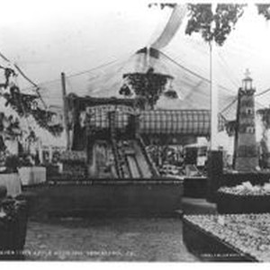 Photo--black and white: Gravenstein Apple Show displays of a lighthouse, a zeppelin (dirigible) and possibly a packinghouse conveyer belt by Stony Point. Other displays and apples in foreground under a large tent. Photo caption: "No 19 Gravenstein Apple Show, 1913. Sebastopol, CAL. Turrill & Miller SF"