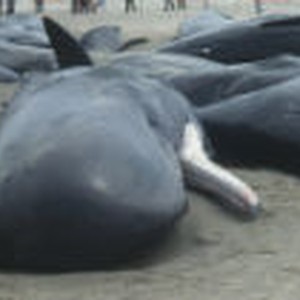 View of a whale's head showing the anterior blowhole, melon, and jaw.