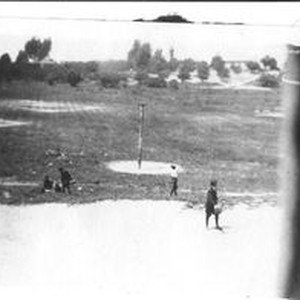 Photo--black and white: Boys at recess on the boy's side of the playground at Sebastopol Primary school playing tether ball about 1920s. Orchard can be seen in distance.