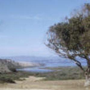 A large tree overlooks sand dunes sweeping along an inlet to Morro Bay.