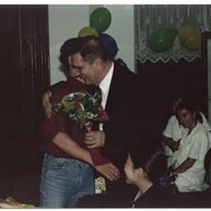 Photograph of Mihael Kuzmič holding a bouquet of flowers embracing someone in gratitude. Other people are visible in the background of this gathering. Balloons festoon the walls. [Description English/roman)]