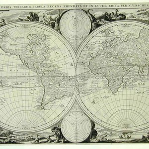 Kashnor notes, "Remarkable from its showing California as a peninsula, contrary to the practice of all other cartographers until about 1710. It identifies the 'Straits of Anian' with the Behring Strait." Kashnor dates as [1679]. Shirley establishes as 1663, Amsterdam, from second bible map, first state. Two sub maps, One of Ptolemaic universe (central earth) the other of Copernican universe with central sun. Art work depicts the four continents. Prime meridian: Ferro. Relief: pictorial. Graphic Scale: No. Projection: Dual Hemisphere. Printing Process: Copper engraving. References: Shirley 431, British Museum Map 463.f.9. Verso Text: MS note: 52.