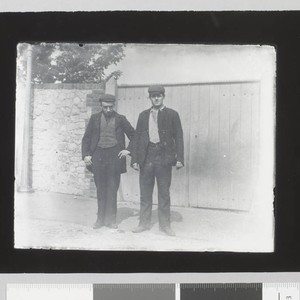 Jack London and "Bert the Cobbler" stand in front of wooden door in stone wall. Title and date transcribed from envelope. Copy print of original. Print is underexposed. Taken while Jack London was in London working on The People of the Abyss. Bert the Cobbler accompanied him on his undercover forays.