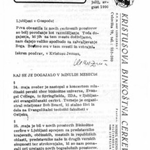 Bilten Kristove pentekostalne crkve u Ljubljani. Broj iz lipnja 1990. godine koji sadrži kratak uvodnik, a zatim izvješća o tome što se događalo u crkvi tijekom svibnja i obavijesti o tome što će se događati u crkvi tijekom razdoblja od lipnja do kolovoza. [Description (original non-English/roman language/script)] Bulletin of the Christ's Pentecostal Church in Ljubljana for June to August, 1990, containing an editorial, report on what went on in the church during May and the notices what will be been happening in the church from June to August. [Description English/roman)]